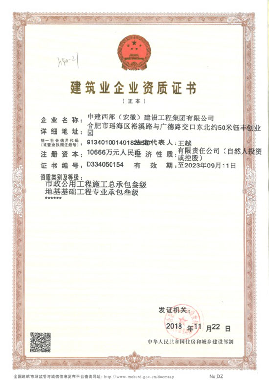 伴隨中建西部經(jīng)營業(yè)務(wù)穩(wěn)步拓展以及整體實(shí)力的不斷提升,2018年11月22日,中建西部建設(shè)再獲合肥市城鄉(xiāng)建設(shè)委員會(huì)批準(zhǔn),在公司原有市政公用工程施工總承包叁級(jí)資質(zhì)基礎(chǔ)上,新增地基基礎(chǔ)工程專業(yè)承包資質(zhì),資質(zhì)等級(jí)叁級(jí)。