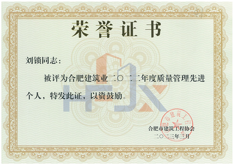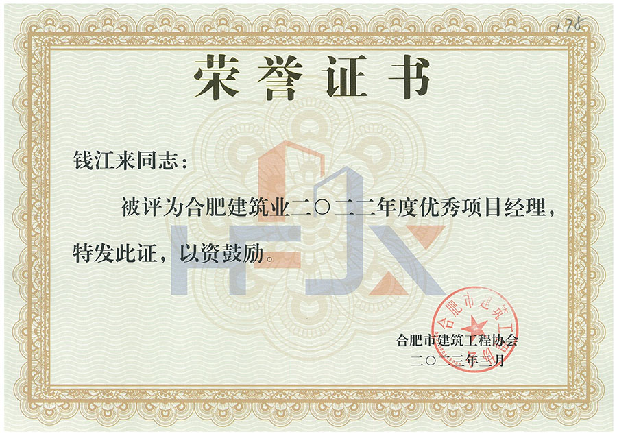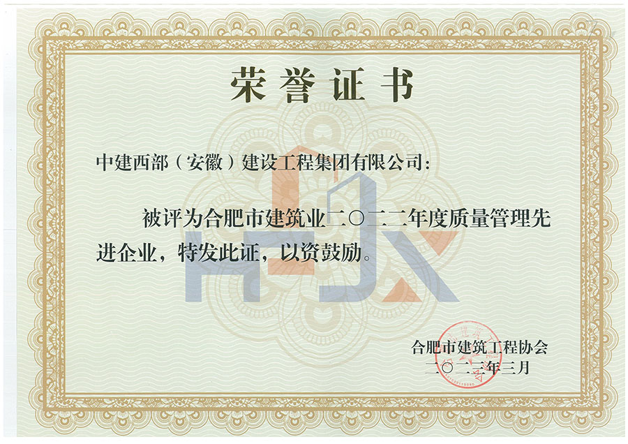 近日,從合肥市建筑工程協會傳來喜訊,中建西部(安徽)建設工程集團有限公司被評為質量管理先進企業和優秀施工企業,錢江來同志被授予優秀項目經理稱號,朱云龍同志被授予安全管理先進個人稱號,劉鎖同志被授予質量管理先進個人稱號。