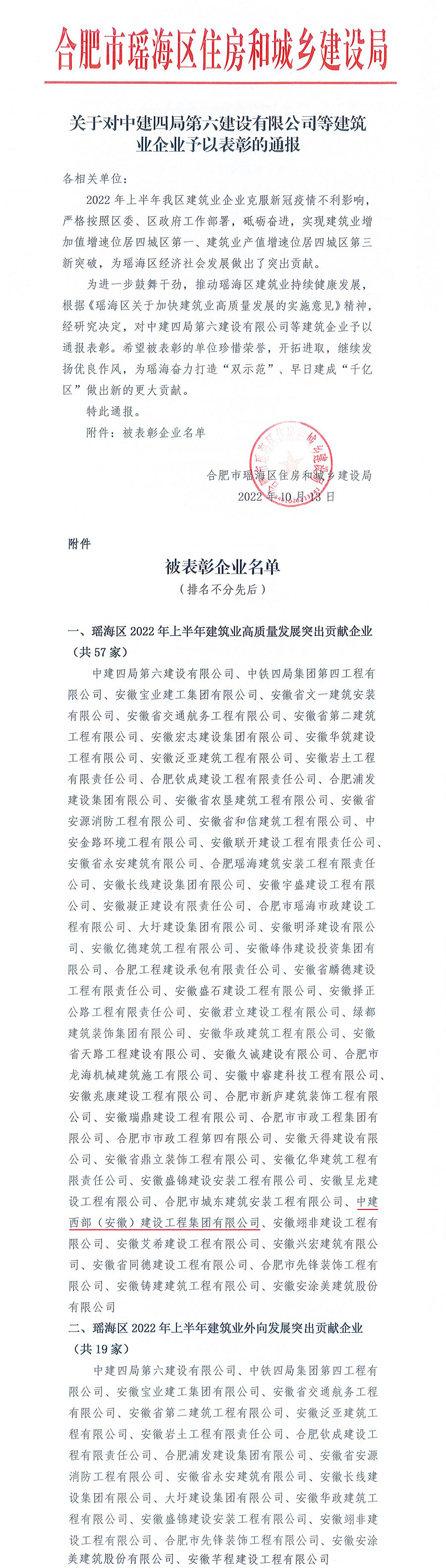 中建西部(安徽)建設(shè)工程集團(tuán)有限公司榮獲瑤海區(qū)高質(zhì)量發(fā)展突出貢獻(xiàn)企業(yè)表彰